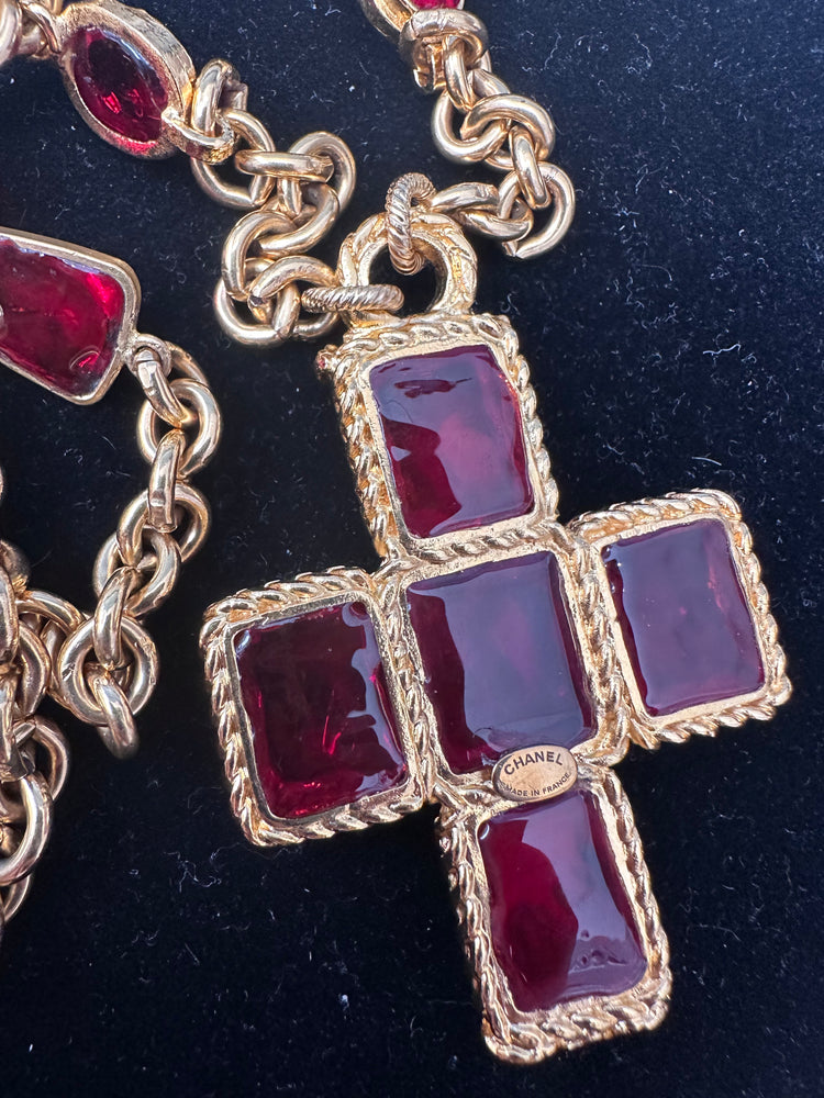 A Chanel Gripoix piece, this bold necklace displays a large gold-toned cross motif decorated with red cabochons hanging from a chunky gold chain. Secure using a hook fastening, this statement piece will uplift any outfit. Layer this 'XL' style with something dainty or gold.