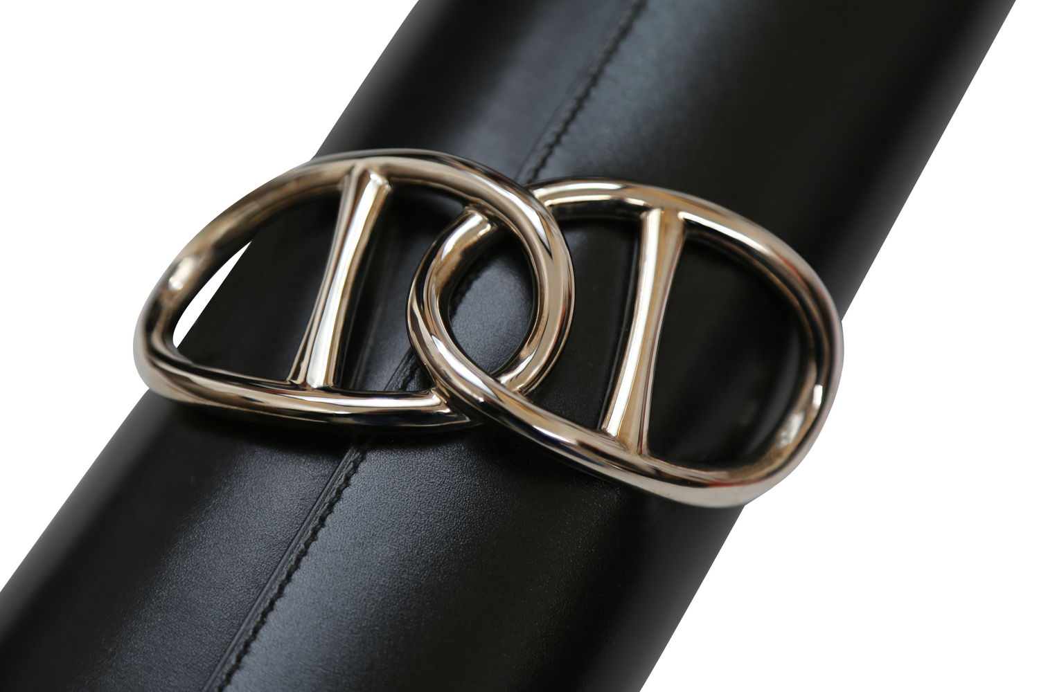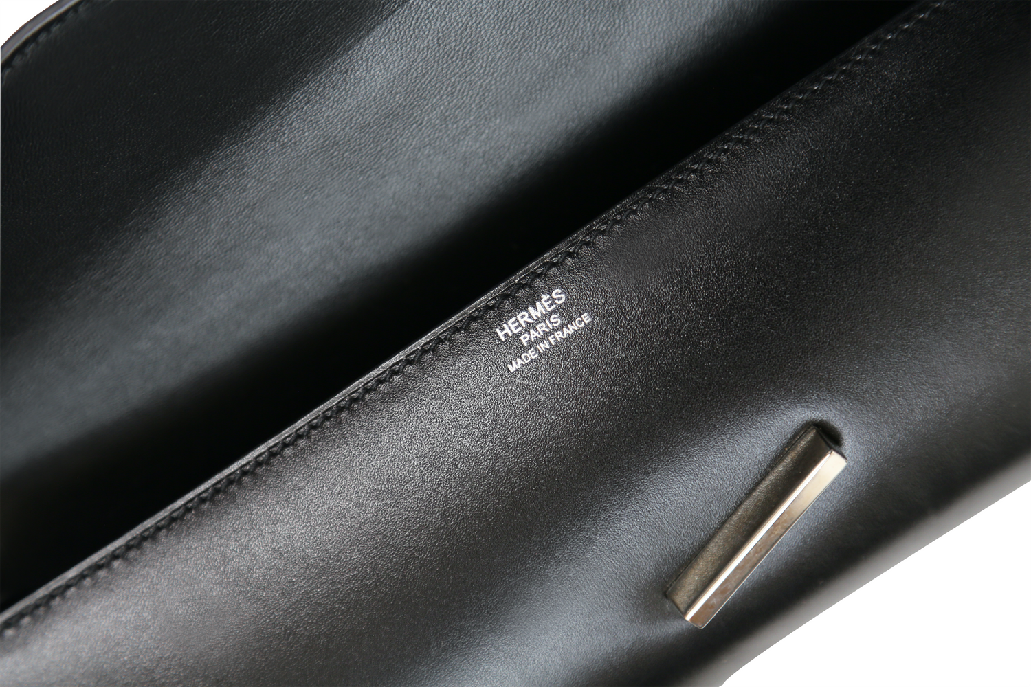 The Egee Black Clutch by Hermès is an authentic and stylish accessory, featuring black smooth calfskin leather and a double polished silver palladium Chain d'Ancre. Its matching leather interior adds a touch of luxury.