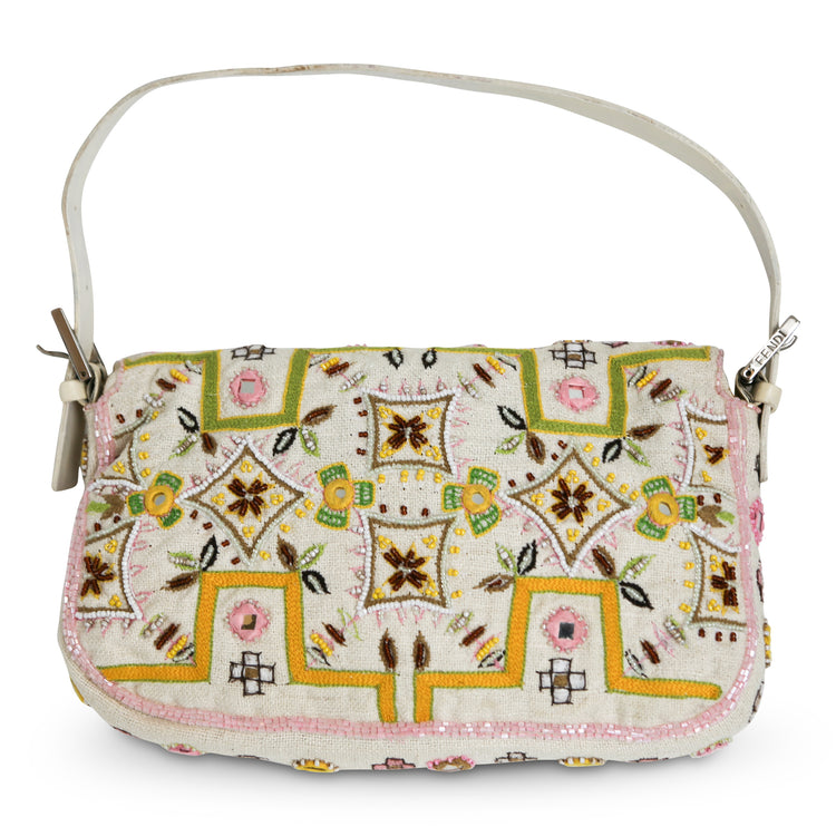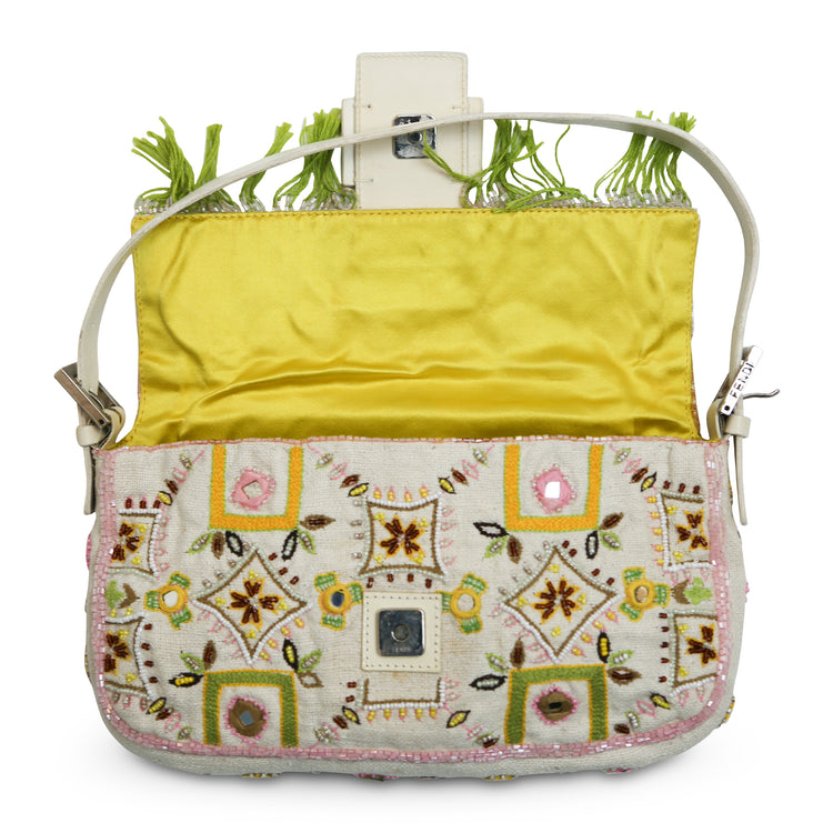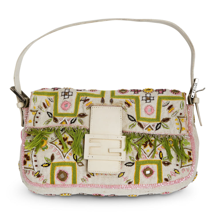 As the most classic handbag from Fendi, this Fringed Cut-out Baguette shoulder bag is a must-have for any fashionista. Meant to be worn snugly under the arm—it was inspired by Parisians carrying their baguettes home from the baker. The design was a deliberate move by Silvia Venturini Fendi away from the larger sizes and utilitarian designs that were trending at the time. This baguette features beautiful embroidery and small mirrors, making it a unique and eye-catching accessory.