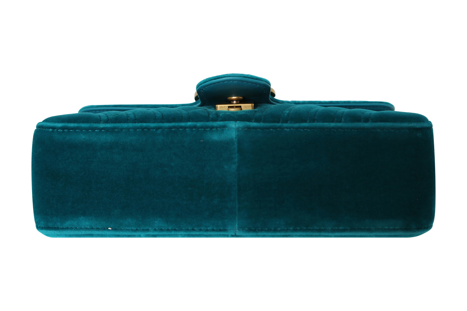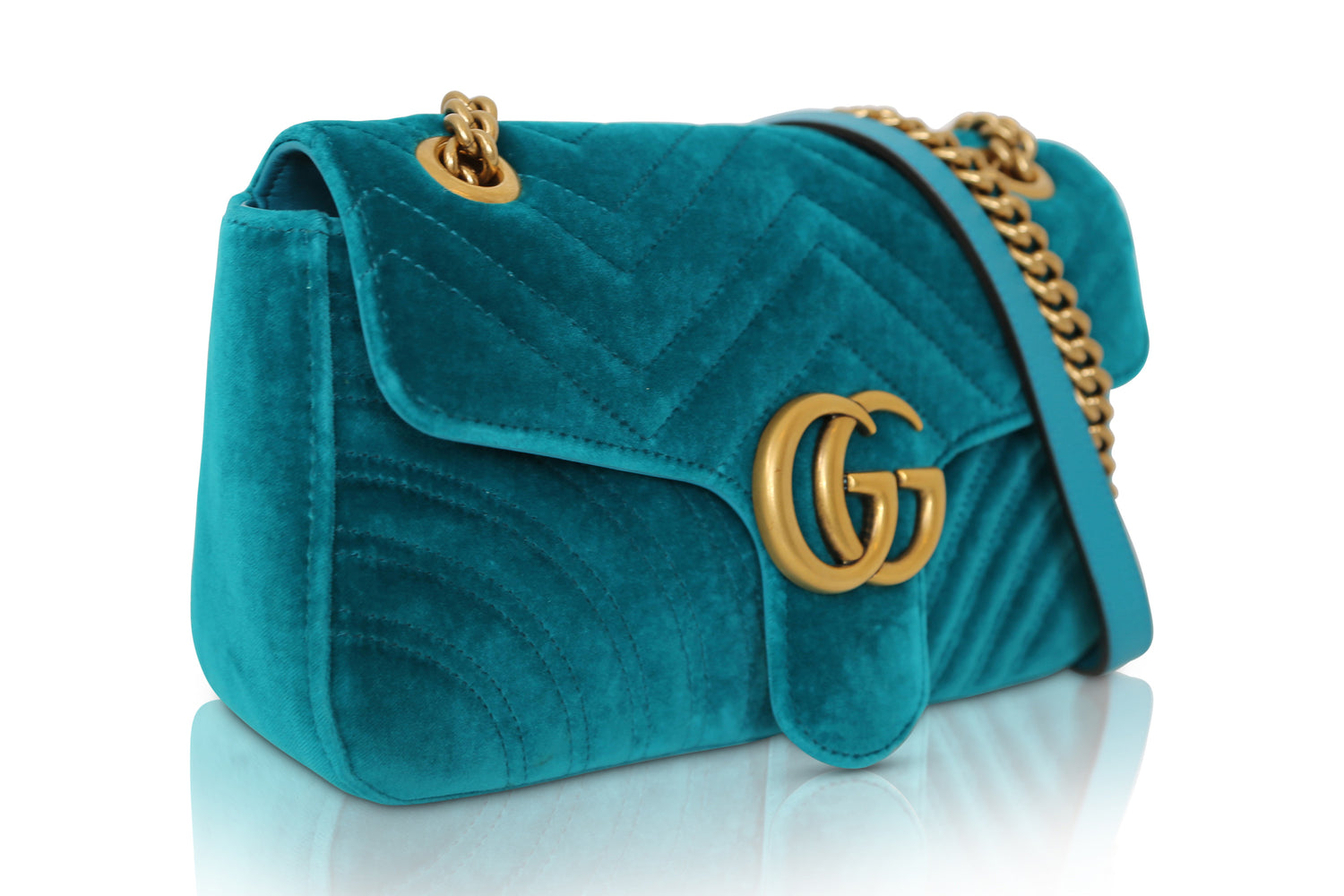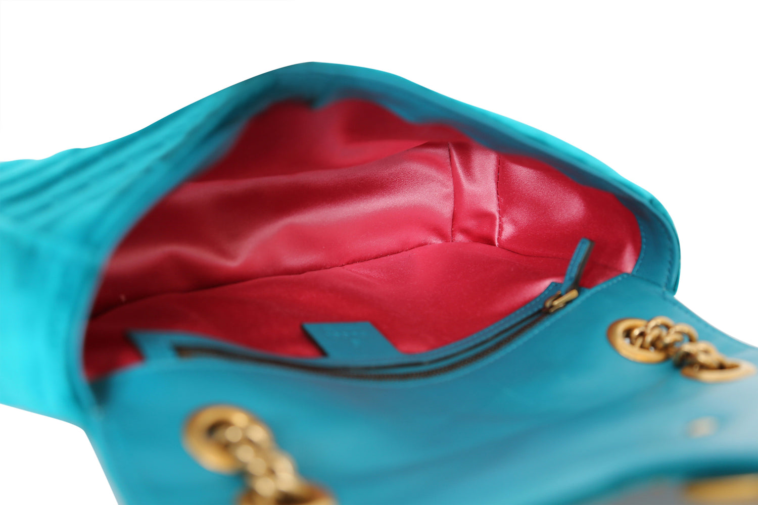 The Gucci Velvet Matelasse Small GG Marmont Shoulder Bag is in turquoise blue. It features a soft velvet exterior, a pink satin interior, and a zipper pocket. The flap, adorned with an interlocking GG logo and push lock, reveals an aged gold chain shoulder strap with a leather shoulder pad.