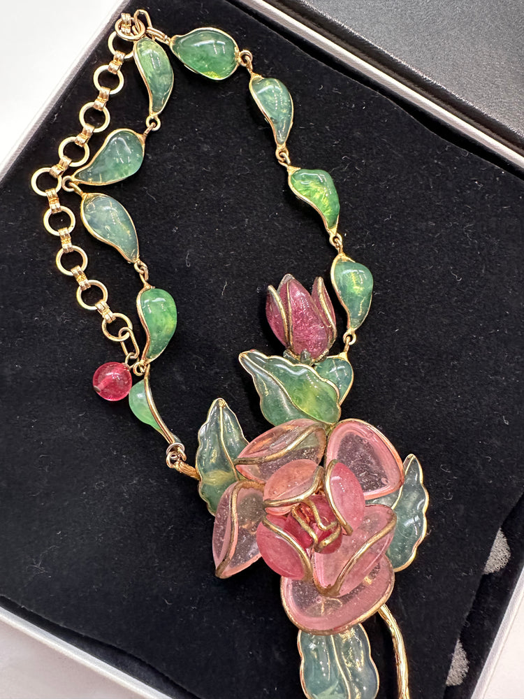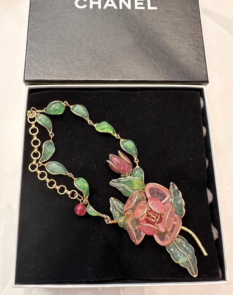 Working alongside Paris' famed jeweller specialising in glass beading, Gripoix Paris, Chanel presents this glass flower necklace. Truly the Gripoix collector's piece of all Gripoix collector's pieces, this is a stunning example of the elegant and masterful collaboration between the two French brands. Featuring the iconic Chanel symbol of the Camelia flower at the centre, the chain acts as the leaves of the flower. This is an unsigned Chanel Gripoix piece from the 1970's.