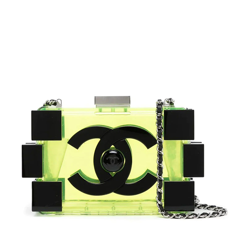 Chanel's playful lego clutch gets a fierce grunge upgrade. This rare and collectable clutch bag from 2013 is formed of translucent plexiglass. Featuring prominent logos across both sides of its hard-case facade and its push closure on top, this piece is a must for any avid Chanel lover. The bag has an optional black leather-laced silver-tone chain strap.